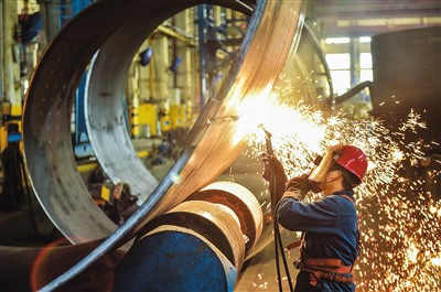 4月18日,河南省洛阳市的中信重工车间内,工人在打磨一批出口的矿用磨机产品。 |