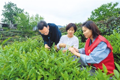 5月19日,潘青青(中)在相见村的“共富茶场”内查看茶树的生长情况。“共富茶场”经过统一管理和品牌推广,能为村民和村集体带来可观的收益。 |