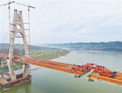 四川宜宾临港长江大桥是国内首座高铁与公路平层布置的斜拉桥、世界最大宽度的公铁两用斜拉桥、世界最大跨度的公铁两用钢箱梁斜拉桥。按照施工计划,将于本月底前合龙。图为即将合龙的宜宾临港长江大桥。