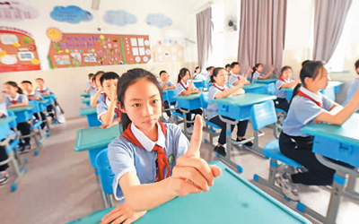 6月6日,浙江省台州市仙居县安洲小学的学生在课间做无接触式眼保健操。