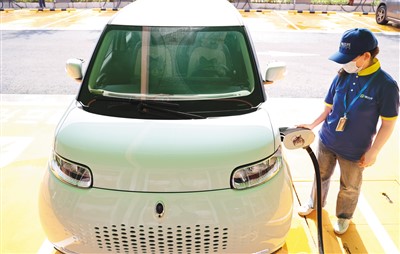 江苏省连云港市海州区依托新能源汽车充电场站项目,全力打造区域形象示范充电站,逐渐形成以核心区域为重点的“1公里”公共充电服务圈。图为在连云港市海州公园充电场站,工作人员给电动汽车充电。 |