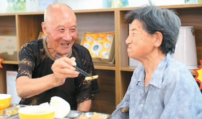 6月30日,在山东省日照市安东卫街道凤凰山社区养老服务中心,一位老人在给老伴夹菜。 |