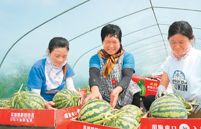 8月3日,在甘肃省兰州市榆中县高崖镇小营子村,村民正将收获的西瓜装箱。 |