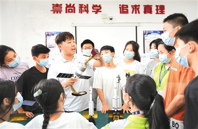 在广西壮族自治区柳州市融水苗族自治县思源实验学校,西北工业大学研究生支教团成员罗伟杰(中间拿模型者)向孩子们模拟演示神舟飞船与天宫空间站对接。 |