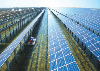 山东省东营市河口区充分利用立体空间,融合“风、光、海、渔”等资源要素,大力发展光伏发电、风力发电等绿色新能源产业,实现经济、生态双丰收。目前,河口区新能源发电装机容量达118万千瓦,新能源年发电量突破18亿千瓦时。图为位于河口区百万亩生态渔业区浅滩内的曙光汇泰渔光电站,当地供电公司工作人员乘船巡检光伏设备。