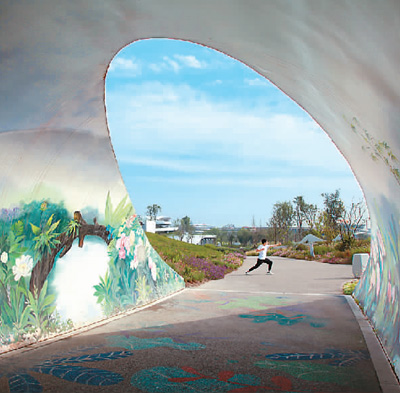 四川省成都东部新区建成林栖公园、龙马湖公园等267座城市公园,新增绿地6000亩,图为市民正在林栖公园彩绘隧道前晨练。 |