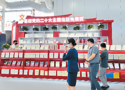 图书节在“喜迎党的二十大”主题出版物展区集中展示了300种相关主题出版物,有《习近平谈治国理政》(多语种版本)、《习近平用典》等阐释习近平新时代中国特色社会主义思想的图书,还有《中国由此改变》《百年大党的关键抉择》《百位著名科学家入党志愿书》《火种——寻找中国复兴之路》《中国能力——抗疫背后的中国之治》等,不少图书展现了党的十八大以来中国在政治、经济、科技、文化、医疗卫生等领域的发展成就。