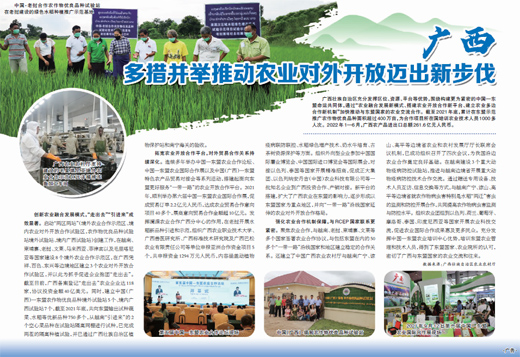 广西壮族自治区充分发挥区位、资源、平台等优势,围绕构建更为紧密的中国—东盟命运共同体,通过“农业融合发展新模式、搭建农业开放合作新平台、建立农业多边合作新机制”加快推动与东盟国家的农业交流合作。截至2021年底,累计在东盟示范推广农作物优良品种面积超过400万亩,为合作项目所在国培训农业技术人员1000多人次。2022年1—6月,广西农产品进出口总额261.6亿元人民币。