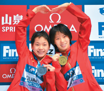 图为女子10米跳台冠军陈芋汐(右)和亚军全红婵在颁奖仪式上合影。