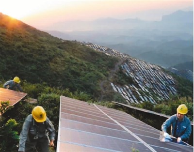 湖北咸宁通山光伏项目装机规模达268兆瓦。国家电网湖北咸宁供电公司积极部署,组织“跑山电工”党员服务队,定期对光伏板进行安全巡检,通过配网无人机系统上传光伏区域巡检台账,利用无人机的高机动性,不受地形环境限制及实时信息传输的优势,保障了工作人员的安全,同时高效地帮助发电厂解决相关用电问题。图为无人机拍摄的“跑山电工”巡检现场。