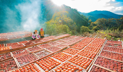 广东省梅州市平远县上举镇畲脑村仓子下有多年加工柿饼传统。当地村民将柿子去皮、揉捏、晾晒后,加工成手工柿饼,销往各地,增收致富。图为近日,村民利用晴好天气晾晒柿饼,呈现出一派红火的丰收景象。