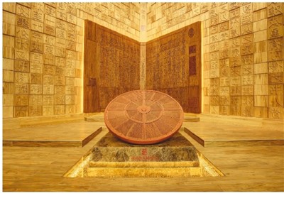 元代王祯发明的转轮排字盘大幅提高了活字印刷的工作效率。展厅里再现了转轮排字盘的使用场景:宽大的圆形转盘上,整齐排列着密密麻麻的木活字,旁边的工人在转动木盘,寻找需要使用的活字。转轮排字盘是世界上最早的排字机械设备,将木活字按韵和型号排列在木制转盘上。通过转动木盘,工人坐着就可以取出所需的字,大大降低了劳动强度。
