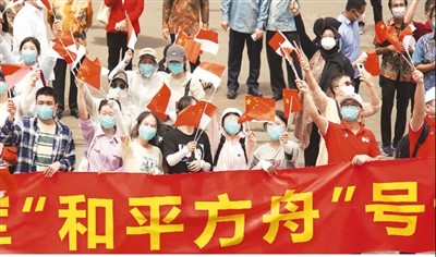 在雅加达,人们欢迎“和平方舟”号医院船。 彭冰洁摄(新华社发)