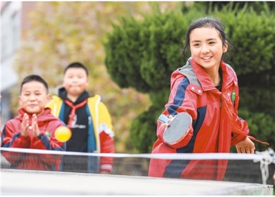 近年来,贵州省毕节市纳雍县维新镇中心小学打造体育特色课间,开展跳绳、拔河、打乒乓球、打篮球、跳高等体育活动,让学生们在享受运动的同时愉悦身心、增强体质。图为11月16日,维新镇中心小学的小学生在打乒乓球。 |