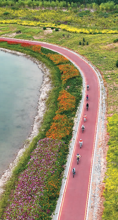 在甘肃省张掖奥林匹克森林公园,骑行爱好者在湖畔绿道上运动。 |