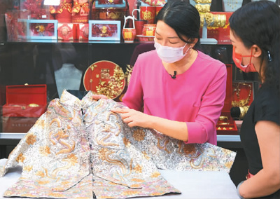 新娘裙褂有褂皇、褂后、大五福、小五福等多种款式。走近一件褂皇细看,金银丝线绣出的图案细密扎实,饱满生动,在灯光下璀璨夺目。制成这样一件嫁衣,需要一年多的时间,其中最难也最费时的是刺绣。林卓怡说,为确保每一件裙褂的图案对称流畅,光泽持久,“刺绣必须由同一位师傅完成,且手上不能有汗,否则会让金银线氧化变色”。他们聘请的刺绣师傅都是从业几十年的老师傅,目前主要集中在江苏苏州。