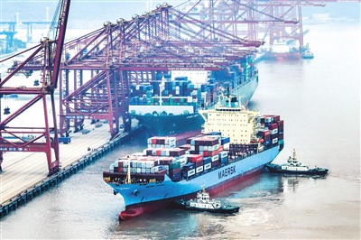 上海洋山港四期自动化码头吞吐作业繁忙有序,超大型货轮正在进行集装箱装卸作业。 |