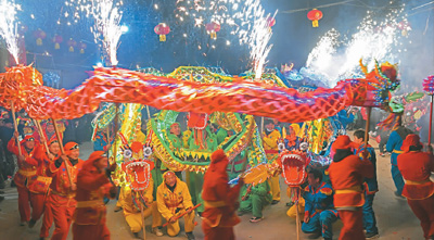 1月26日,河南省孟州市槐树乡龙台村灯火璀璨、彩龙劲舞,被列入第三批国家级非物质文化遗产名录的火龙舞在这里精彩展演,节日气氛浓厚。