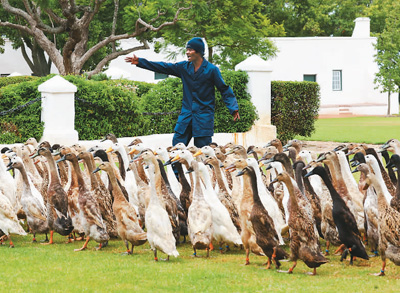 南非开普敦一家酒庄饲养了成百上千只印度跑鸭。这些鸭子们在葡萄园内“辛勤工作”,每天会在庄园内“巡逻”,将有害昆虫吃掉,像是行走的杀虫剂。图为鸭子们在南非开普敦的葡萄酒庄内“巡逻”。