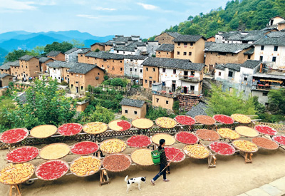 安徽省黄山市歙县阳产土楼晒秋图景。 |
