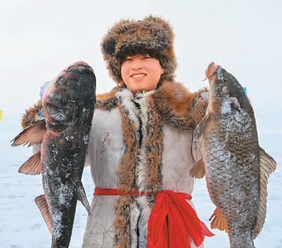 在新疆维吾尔自治区福海县第十六届乌伦古湖冬捕文化旅游节上,渔工展示刚捕到的鱼。 |
