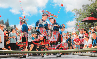 湖南省怀化市靖州苗族侗族自治县藕团乡新街村芦笙节上,村民在跳竹竿舞。 |