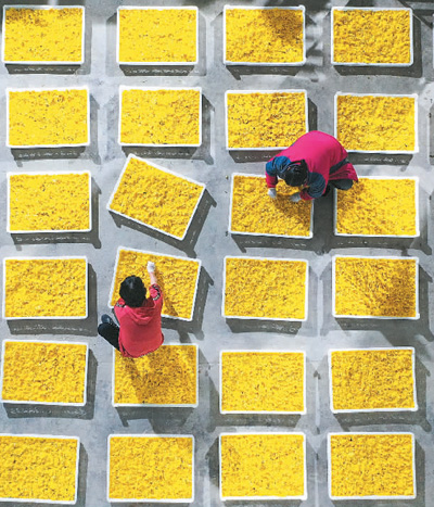 村民在贵州省贵定县云雾镇一家菊花加工车间摊晾金丝皇菊。 |