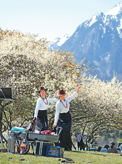 四川省九寨沟县漳扎镇中查沟村民在草甸上直播。 |