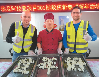 在中建八局二公司承建的埃及阿拉曼新城超高综合体项目D01标段上,中埃员工包饺子迎新年。 |