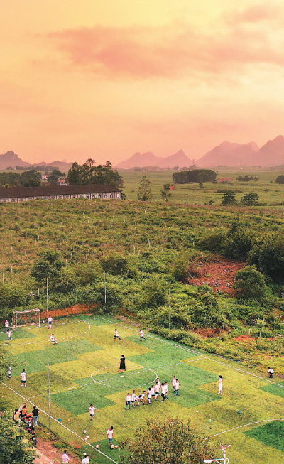 在柳江区穿山镇高平村平地屯,孩子们在公益教练的陪同下练习踢足球。 |