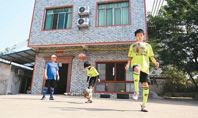 在柳江区进德镇白山村波涛屯,兄妹两人在家长陪伴下在家门口进行颠球训练。 |