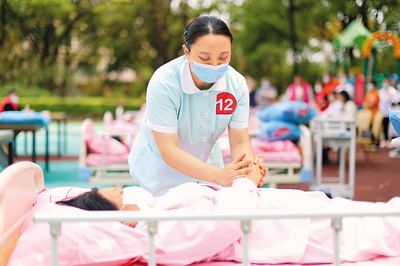 参赛选手正在参加养老护理员技能比赛。