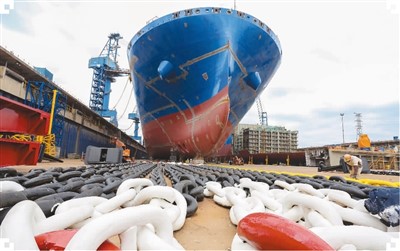 位于江苏省扬州市江都区的扬州中远海运重工有限公司是中国远洋海运集团在江苏省建立的造船基地,客户除国内主要航运公司外,还覆盖希腊、法国、挪威等国家主流航运公司。目前,该公司开足马力抓生产,在手订单共计41艘,2023年公司全年计划交付新船19艘。图为工人在施工作业。