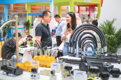 5月15日,在湖南省长沙国际会展中心,观众(右)在了解展出的工程机械配件。当日,第三届长沙国际工程机械展览会闭幕。据悉,本届展会吸引全球1502家企业参展,展品超过2万件,展览面积达30万平方米。4天展期累计观众超过35万人次,展会交易额累计536亿元。