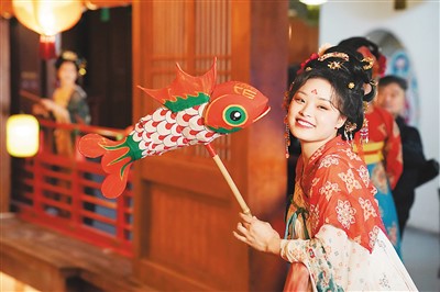 游客在西安“长安十二时辰”主题街区内拍照游玩。 新华社记者 邵 瑞摄