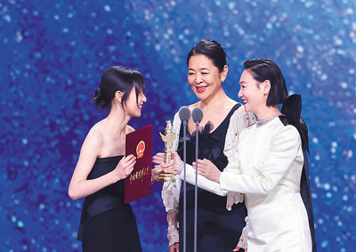 倪萍(中)、惠英红(右)为获得第十九届中国电影华表奖优秀女演员奖的张子枫颁奖。 |