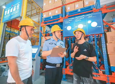 今年6月是第22个全国“安全生产月”。为增强企业安全防范意识,确保企业安全有序生产,江苏省淮安市盱眙县公安局工业开发区派出所组织民警深入辖区企业开展“送服务进企业”活动,帮助企业防范化解生产中易发生的风险隐患,加强警企联系沟通,推动优化营商环境。图为民警在工业开发区一家公司了解安全生产情况。