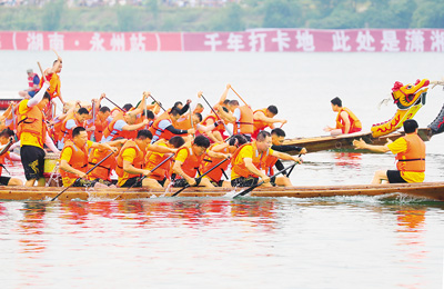 在端午节来临之际,“永州陆港杯”2023年中国龙舟公开赛(湖南永州站)在湘江湖南省永州市冷水滩区潇湘平湖段水域举行,来自广东、福建、湖北、重庆等地的19支专业代表队和大众组12支队伍参加了本次角逐。运动健儿们奋力划桨,湖面上一艘艘龙舟劈波斩浪,鼓声、掌声、呐喊声让河流两岸成为欢乐的海洋。