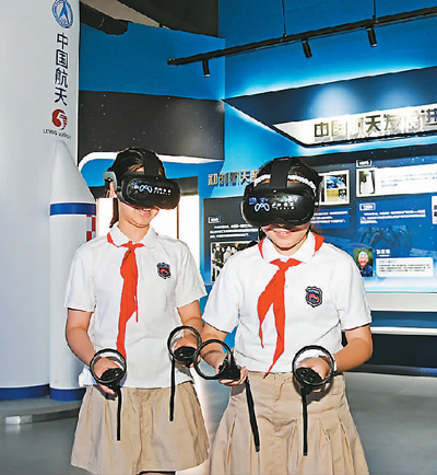 近日,在江苏省常州市龙锦小学少年科学院内,学生们利用VR虚拟技术,跟随神舟飞船遨游太空,探索天宫空间站。