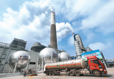 走进泰州电厂厂区,三座高耸的作业塔映入眼帘。沿着绵长的蓝、白色管道向前望去,4个巨大的银色球型储气罐与之相连,源源不断输送着经过压缩的液态二氧化碳,等待通过运输车装载送往下游各地。