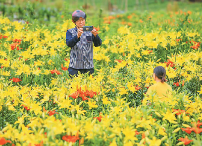湖南省湘西土家族苗族自治州龙山县打造1000亩百合花海,单日订单超8000枝,已成为当地增收致富的重要途径。图为游客在龙山县洗洛镇欧溪村百合花基地游玩。
