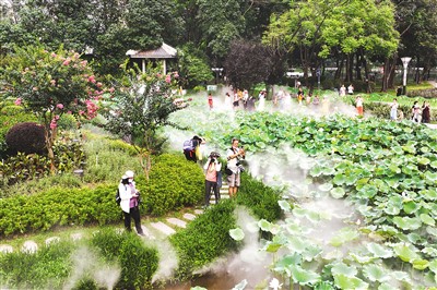 近日,广东省佛山市亚洲艺术公园荷花陆续绽放,吸引游客前来赏花。公园管理方还特地布置了雾景,现场如梦如幻。