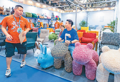 日前,第十五届苏州家具展览会在江苏省苏州国际博览中心举办。本届家具展面积近10万平方米,设精品家具、现代生活等七大主题展区,为专业观众与普通消费者打造了“一站式”采购平台。图为观众在该展览会上咨询选购。