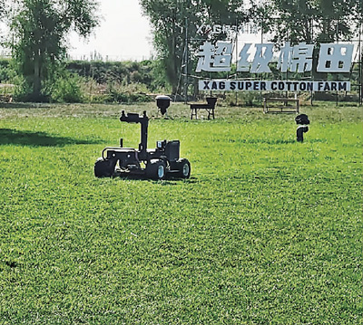 在新疆维吾尔自治区巴音郭楞蒙古自治州尉犁县极飞科技公司的“超级棉田”,无人割草机器正在平整草地。 |