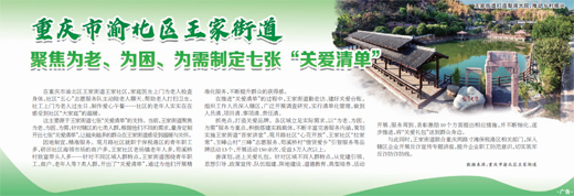 在重庆市渝北区王家街道王家社区,家庭医生上门为老人检查身体,社区“五心”志愿服务队主动陪老人聊天、帮助老人打扫卫生,社工上门为老人过生日、制作爱心午餐……社区的老年人实实在在感受到社区“大家庭”的温暖。