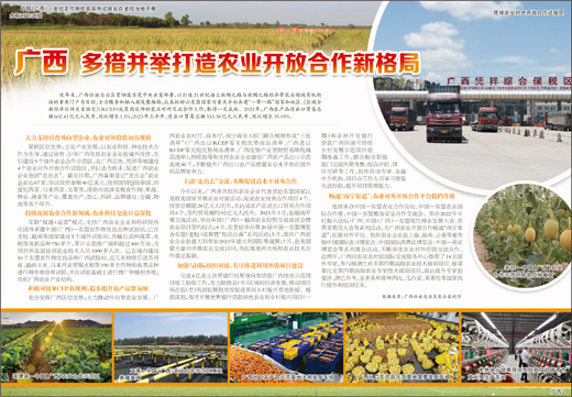紧抓区位优势,立足产业发展,以农业科技、种业技术合作为先导,通过培育、引导广西优质农业企业赴境外投资,先后建设9个境外农业合作示范区,在广西百色、凭祥等地建设4个农业对外开放合作试验区,并以此为抓手,促进广西农业企业抱团“走出去”。截至目前,广西备案登记“走出去”农业企业达67家,协议投资金额40亿美元,投资国别包括泰国、印度尼西亚、马来西亚、文莱等,投资内容涉及粮食作物、果蔬、种业、渔业等产业,覆盖生产、加工、科研、品牌建设、仓储、物流等各个环节。