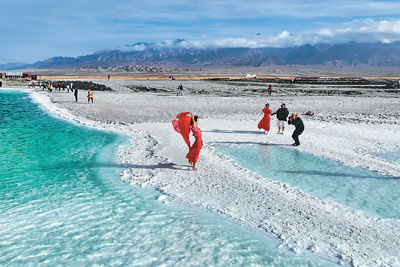 人们在青海省海西蒙古族藏族自治州大柴旦翡翠湖游玩。 本报记者 贺 勇摄