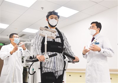 图为神经内科主任郝峻巍(右)正在指导急性脑梗死患者进行超早期神经功能康复训练。 |