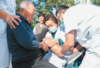 日前,在北京朝阳区清友园社区文化广场,航空总医院开展“我为群众办实事”暨纪念“双桥老太太”罗有明逝世15周年主题义诊活动,为深受骨关节损伤疾病困扰的居民施以罗氏手法检查、诊断与治疗。活动现场,8名罗氏正骨医师为居民解答常见骨科病症及预防中老年骨折、扭伤等各类咨询问题,发放健康资料。