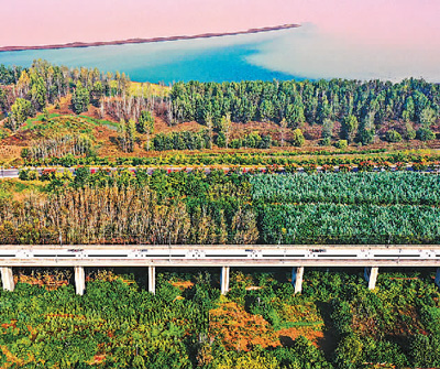 河南省三门峡市秋意渐浓,动车组列车沿着黄河生态廊道飞驰而过。 |